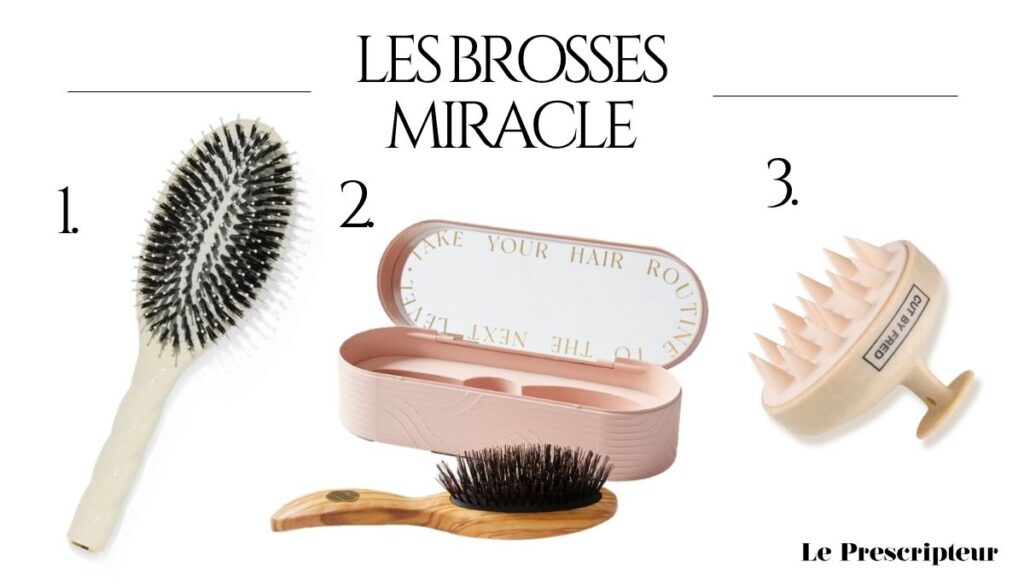 1. La Bonne Brosse, N°03, La Brosse Cuir Chevelu Sensible, 142€ | 2. Altesse, Brosse de soin cheveux fins et normaux, moyen modèle en poils de sanglier, 180€ | 3. Cut by Fred, Stimulating Scalp Brush, 16€