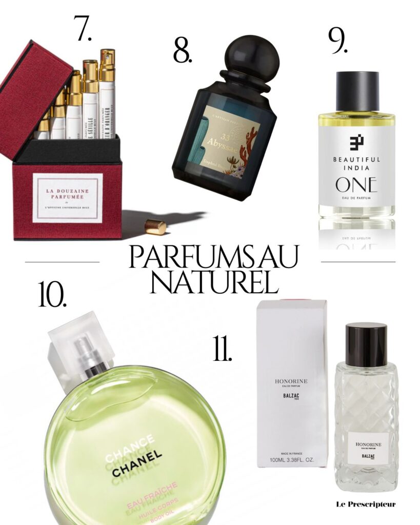 Chanel : les grandes maisons aussi font des efforts sur leur composition et chez Chanel, on peut par exemple trouver l’Huile Corps Chance Fraîche, composée à 88 % d’ingrédients d’origine naturelle (norme ISO), aux contenants majoritairement recyclables et qui peut s’utiliser comme parfum.