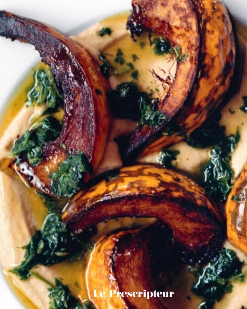 Laver le potiron ou la courge (on va garder la peau), puis coupez-le en deux. Retirez les graines et la pulpe, et tranchez la chair en gros morceaux. Enduisez-les d’une généreuse quantité d’huile d’olive, salez et poivrez, puis disposez-les sur une plaque de four. Faites-les rôtir 20 à 30 minutes jusqu’à ce qu’ils soient bien dorés mais tendres.